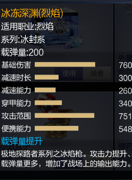 急冻深渊相对于训练用冰雾枪而言,拥有更高的伤害,而且载弹也从180提升到了200,不过对于烈焰的攻击速度而言,也就是几秒的事儿,几乎可以忽略不计。